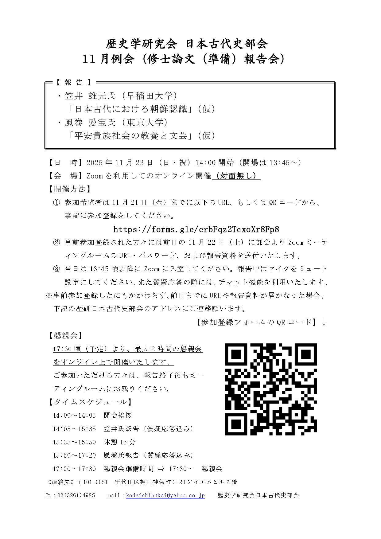 いつも大変お世話になっております。歴史学研究会日本古代史部会事務局です。